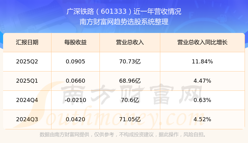 廣深鐵路2025年第二季度顯示,公司主營收入70.73億元,同比11.84%;歸母凈利潤6.41億元,同比75.38%;扣非凈利潤6.42億元,同比78.14%;