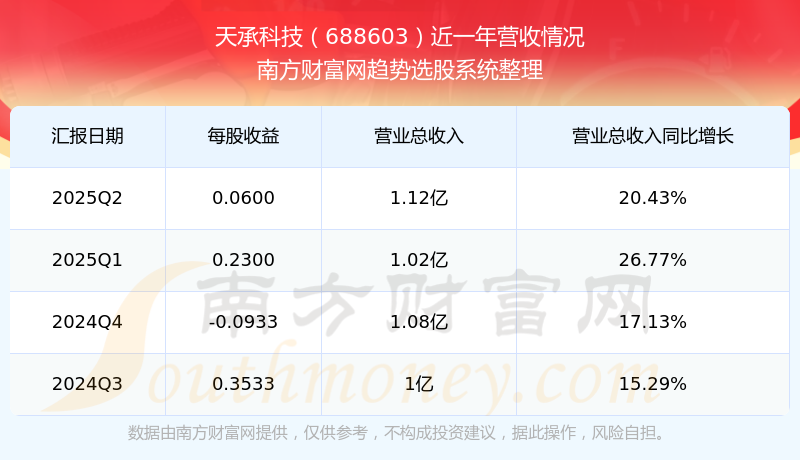 在2025年第二季度,天承科技的業(yè)績(jī)表現(xiàn),主營(yíng)業(yè)務(wù)收入達(dá)到1.12億元,實(shí)現(xiàn)了20.43%的同比增長(zhǎng)率。同時(shí),公司歸母凈利潤(rùn)錄得1776.03萬(wàn)元,同比增長(zhǎng)-5.08%。