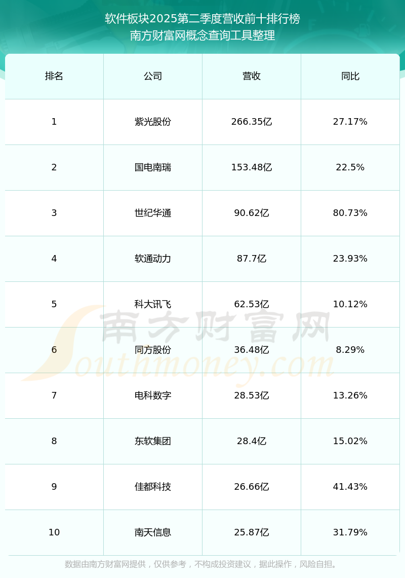 按照南方財(cái)富網(wǎng)概念查詢工具統(tǒng)計(jì),該股所屬板塊為軟件板塊,該板塊共有246只股票,山石網(wǎng)科2025第二季度營(yíng)收在該板塊中排名為第123名,該板塊2025第二季度營(yíng)收排名前十的股票如下表: