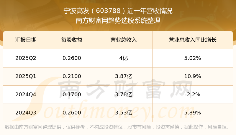 寧波高發(fā)2025年第二季度財(cái)報(bào)顯示,公司主營(yíng)收入4億元,同比5.02%;歸母凈利潤(rùn)5766.03萬(wàn)元,同比10.63%;扣非凈利潤(rùn)5575.87萬(wàn)元,同比12.59%;