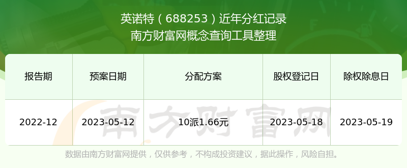 英諾特最新一次公布的分紅方案為10派1.66元。本次權(quán)益分派股權(quán)登記日為2023年5月18日,除權(quán)除息日為2023年5月19日,派息日為2023年5月19日。