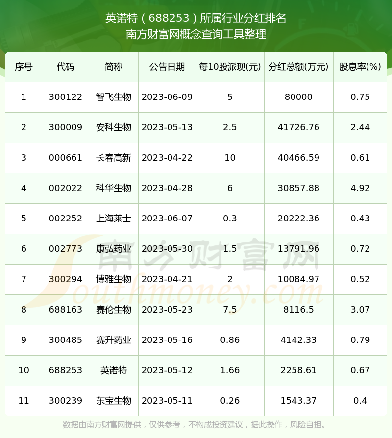 按照南方財(cái)富網(wǎng)趨勢(shì)選股系統(tǒng)統(tǒng)計(jì),英諾特所屬行業(yè)為生物制品行業(yè),生物制品行業(yè)分紅排名情況如下表:
