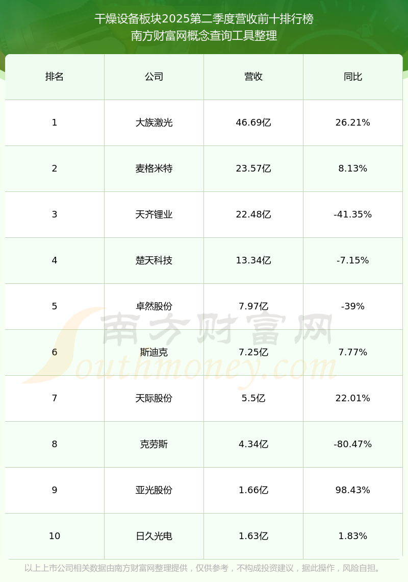 按照南方財富網(wǎng)概念查詢工具統(tǒng)計,該股所屬板塊為干燥設備板塊,該板塊共有12只股票,信宇人2025第二季度營收在該板塊中排名為第12名,該板塊2025第二季度營收排名前十的股票如下表: