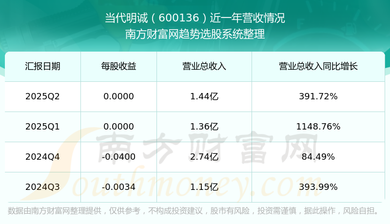 于2025年第二季度,當(dāng)代明誠(chéng)披露了其業(yè)績(jī)表現(xiàn),其中主營(yíng)業(yè)務(wù)收入1.44億元,相較于去年同期391.72%。此外,公司歸屬于母公司的凈利潤(rùn)為-418.04萬元。在扣除所有非經(jīng)常性損益后,凈利潤(rùn)-813.17萬元,同比增長(zhǎng)40.64%。