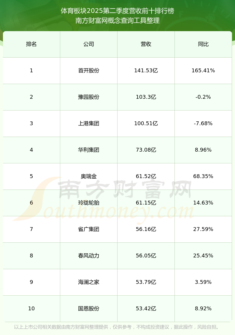 按照南方財(cái)富網(wǎng)概念查詢工具統(tǒng)計(jì),該股所屬板塊為體育板塊,該板塊共有134只股票,當(dāng)代明誠(chéng)2025第二季度營(yíng)收在該板塊中排名為第116名,該板塊2025第二季度營(yíng)收排名前十的股票如下表: