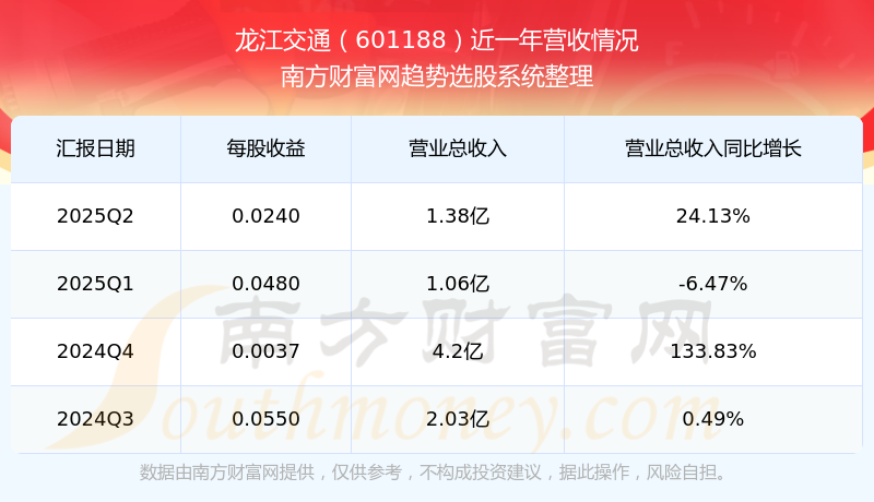 按照南方財(cái)富網(wǎng)概念查詢工具統(tǒng)計(jì),該股所屬板塊為鐵路公路板塊,該板塊共有120只股票,龍江交通2025第二季度營(yíng)收在該板塊中排名為第120名,該板塊2025第二季度營(yíng)收排名前十的股票如下表: