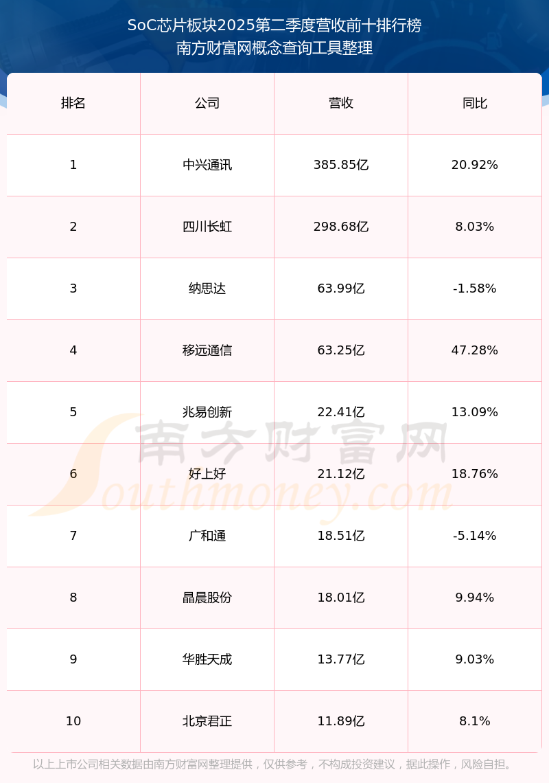 按照南方財(cái)富網(wǎng)概念查詢工具統(tǒng)計(jì),該股所屬板塊為SoC芯片板塊,該板塊共有52只股票,晶華微2025第二季度營收在該板塊中排名為第52名,該板塊2025第二季度營收排名前十的股票如下表: