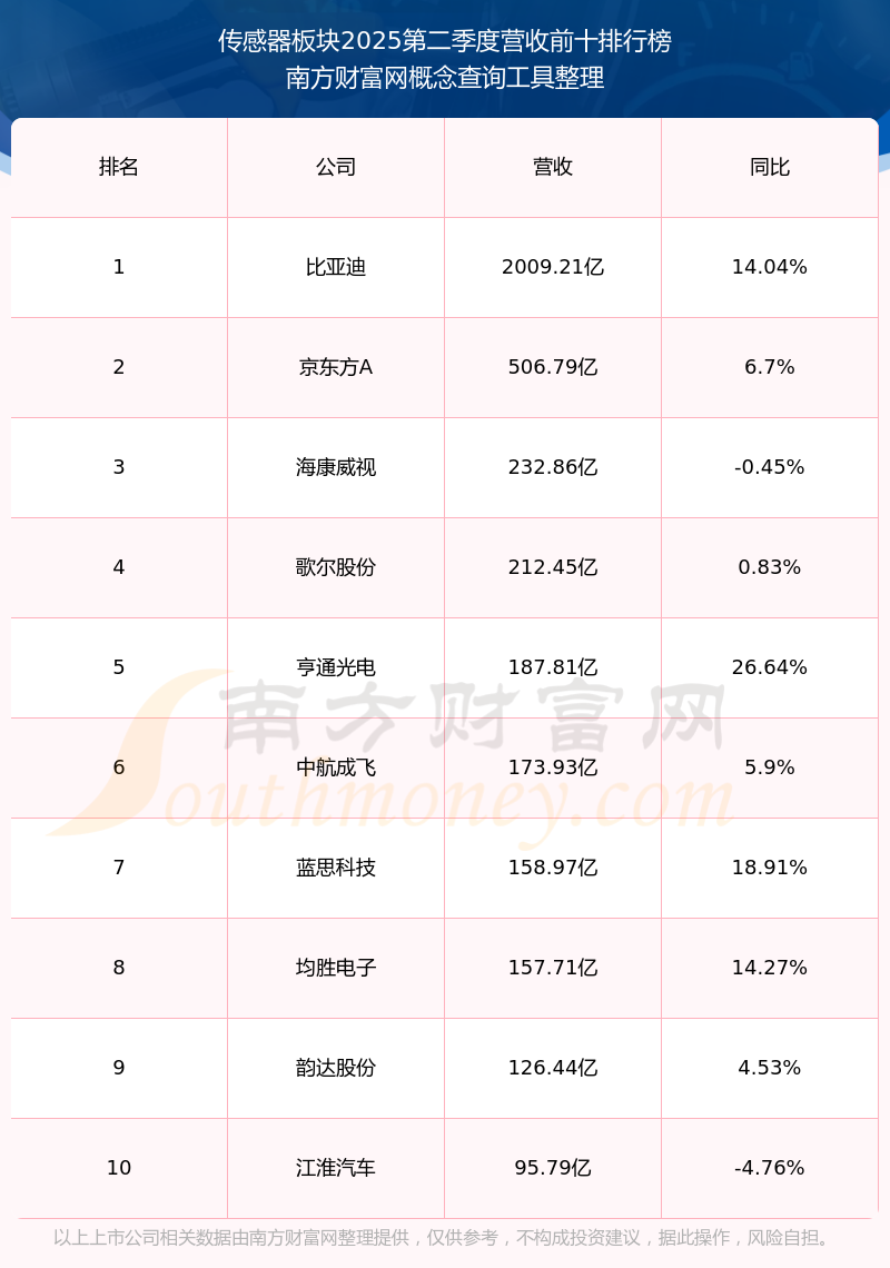 按照南方財富網(wǎng)概念查詢工具統(tǒng)計,該股所屬板塊為傳感器板塊,該板塊共有177只股票,豪威集團2025第二季度營收在該板塊中排名為第14名,該板塊2025第二季度營收排名前十的股票如下表: