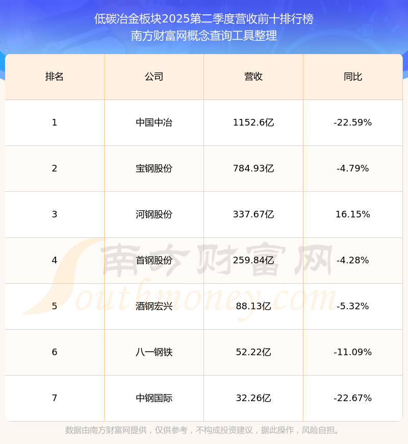 按照南方財富網(wǎng)概念查詢工具統(tǒng)計,該股所屬板塊為低碳冶金板塊,該板塊共有7只股票,八一鋼鐵2025第二季度營收在該板塊中排名為第6名,該板塊2025第二季度營收排名前十的股票如下表: