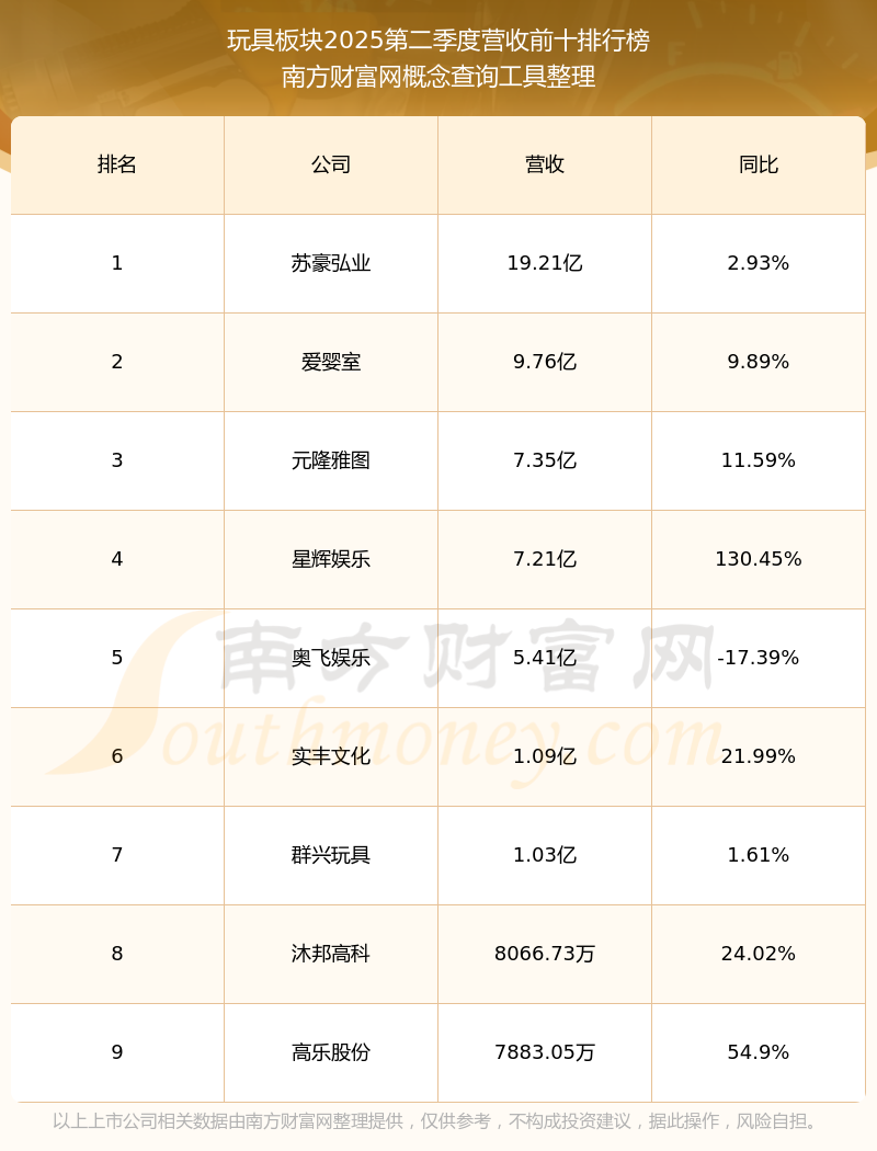 按照南方財(cái)富網(wǎng)概念查詢工具統(tǒng)計(jì),該股所屬板塊為玩具板塊,該板塊共有9只股票,沐邦高科2025第二季度營收在該板塊中排名為第8名,該板塊2025第二季度營收排名前十的股票如下表: