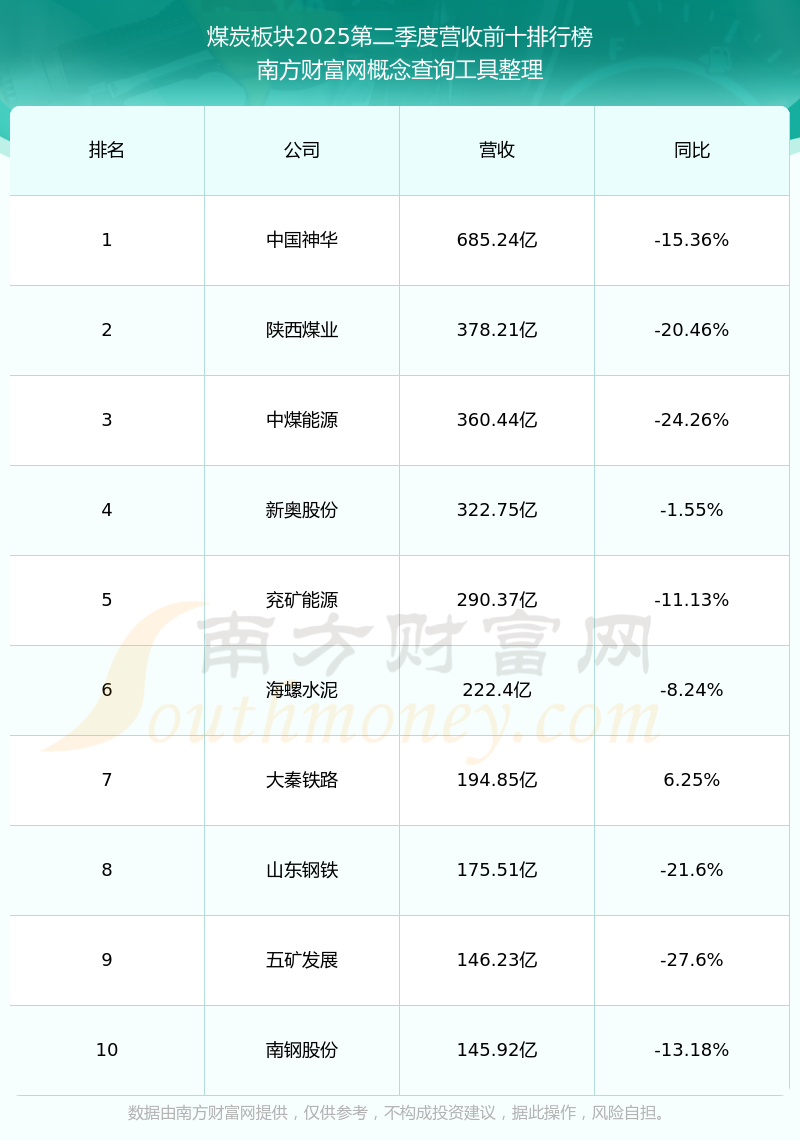 按照南方財富網(wǎng)概念查詢工具統(tǒng)計,該股所屬板塊為煤炭板塊,該板塊共有71只股票,中國神華2025第二季度營收在該板塊中排名為第1名,該板塊2025第二季度營收排名前十的股票如下表: