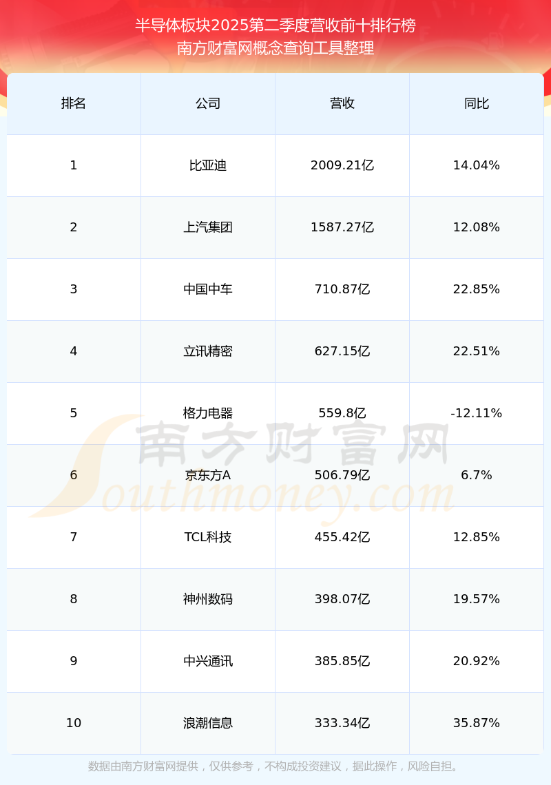 按照南方財(cái)富網(wǎng)概念查詢(xún)工具統(tǒng)計(jì),該股所屬板塊為半導(dǎo)體板塊,該板塊共有529只股票,晶方科技2025第二季度營(yíng)收在該板塊中排名為第320名,該板塊2025第二季度營(yíng)收排名前十的股票如下表:
