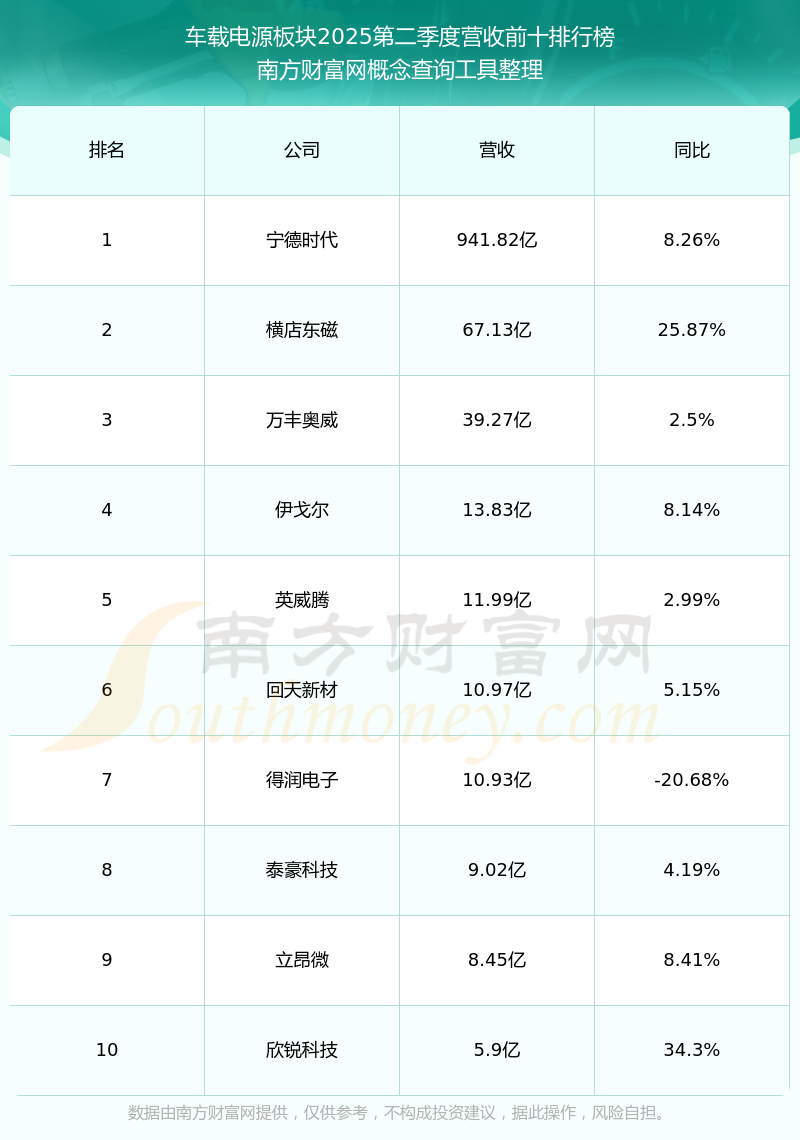 按照南方財富網(wǎng)概念查詢工具統(tǒng)計,該股所屬板塊為車載電源板塊,該板塊共有14只股票,威邁斯2025第二季度營收在該板塊中排名為第14名,該板塊2025第二季度營收排名前十的股票如下表: