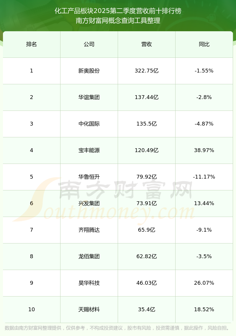 按照南方財(cái)富網(wǎng)概念查詢工具統(tǒng)計(jì),該股所屬板塊為化工產(chǎn)品板塊,該板塊共有64只股票,巨化股份2025第二季度營(yíng)收在該板塊中排名為第64名,該板塊2025第二季度營(yíng)收排名前十的股票如下表: