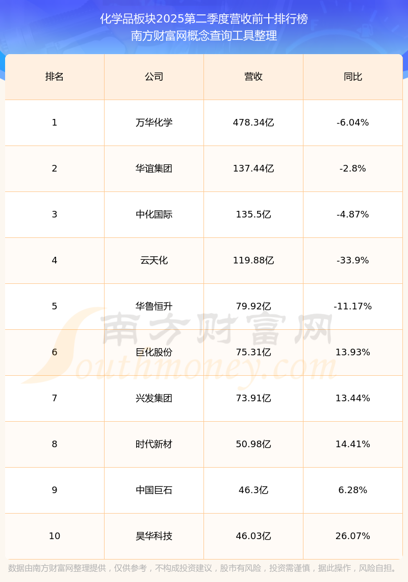 按照南方財富網(wǎng)概念查詢工具統(tǒng)計,該股所屬板塊為化學(xué)品板塊,該板塊共有79只股票,恒興新材2025第二季度營收在該板塊中排名為第79名,該板塊2025第二季度營收排名前十的股票如下表: