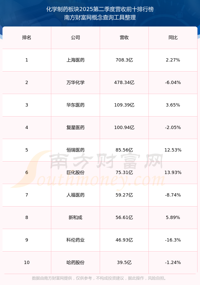 按照南方財(cái)富網(wǎng)概念查詢工具統(tǒng)計(jì),該股所屬板塊為化學(xué)制藥板塊,該板塊共有175只股票,靈康藥業(yè)2025第二季度營收在該板塊中排名為第147名,該板塊2025第二季度營收排名前十的股票如下表: