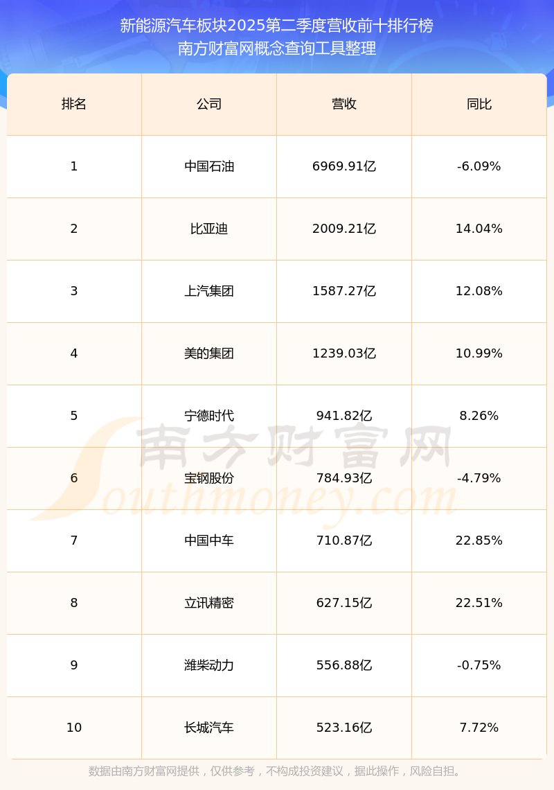 按照南方財富網(wǎng)概念查詢工具統(tǒng)計,該股所屬板塊為新能源汽車板塊,該板塊共有954只股票,先惠技術(shù)2025第二季度營收在該板塊中排名為第459名,該板塊2025第二季度營收排名前十的股票如下表: