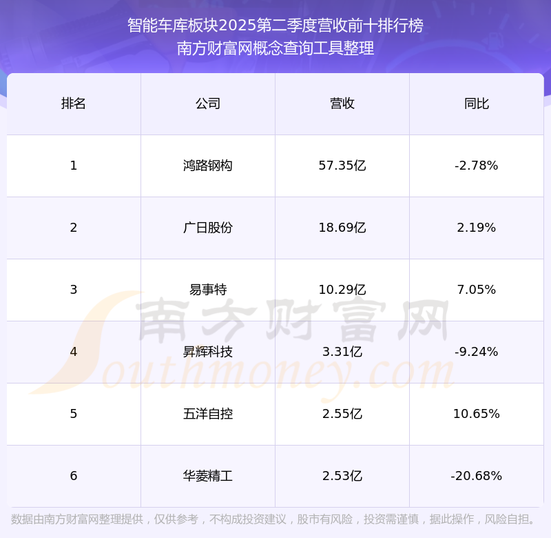按照南方財(cái)富網(wǎng)概念查詢工具統(tǒng)計(jì),該股所屬板塊為智能車庫板塊,該板塊共有6只股票,華菱精工2025第二季度營收在該板塊中排名為第6名,該板塊2025第二季度營收排名前十的股票如下表: