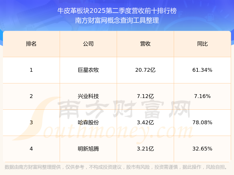 按照南方財(cái)富網(wǎng)概念查詢工具統(tǒng)計(jì),該股所屬板塊為牛皮革板塊,該板塊共有4只股票,明新旭騰2025第二季度營(yíng)收在該板塊中排名為第4名,該板塊2025第二季度營(yíng)收排名前十的股票如下表: