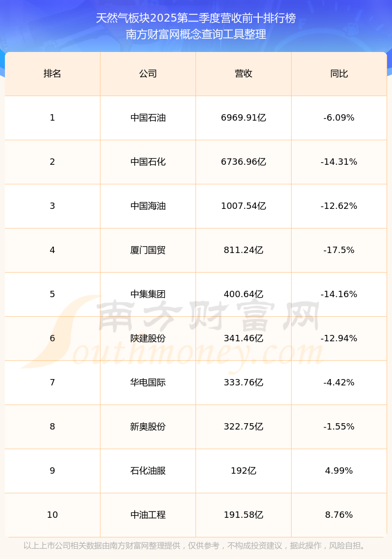 按照南方財富網(wǎng)概念查詢工具統(tǒng)計,該股所屬板塊為天然氣板塊,該板塊共有154只股票,新疆火炬2025第二季度營收在該板塊中排名為第119名,該板塊2025第二季度營收排名前十的股票如下表: