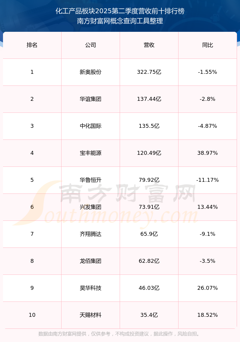 按照南方財富網(wǎng)概念查詢工具統(tǒng)計,該股所屬板塊為化工產(chǎn)品板塊,該板塊共有64只股票,艾森股份2025第二季度營收在該板塊中排名為第64名,該板塊2025第二季度營收排名前十的股票如下表: