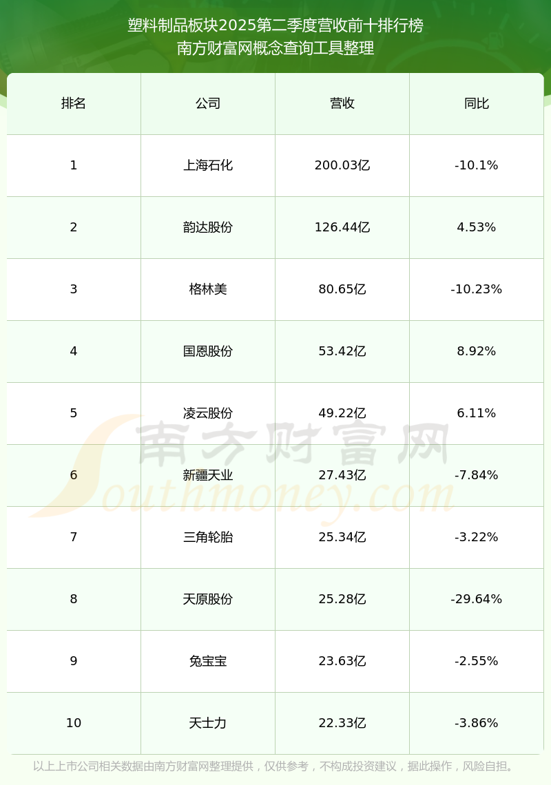 按照南方財(cái)富網(wǎng)概念查詢工具統(tǒng)計(jì),該股所屬板塊為塑料制品板塊,該板塊共有79只股票,阿科力2025第二季度營(yíng)收在該板塊中排名為第79名,該板塊2025第二季度營(yíng)收排名前十的股票如下表:
