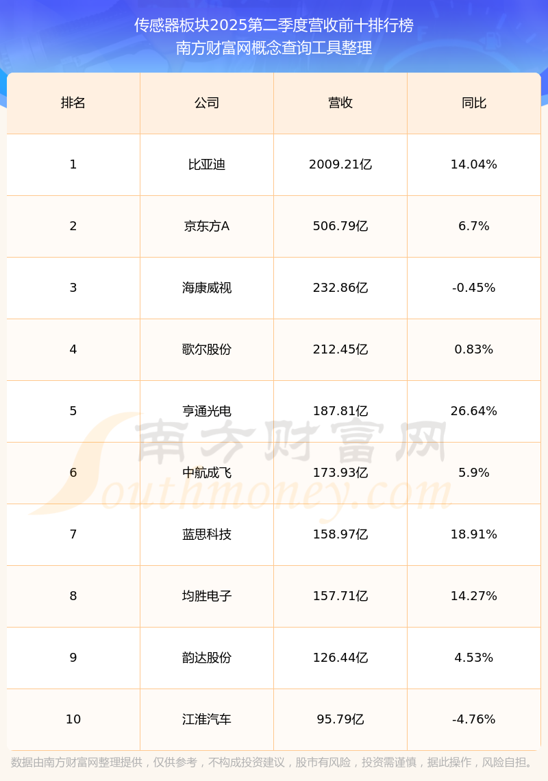 按照南方財(cái)富網(wǎng)概念查詢工具統(tǒng)計(jì),該股所屬板塊為傳感器板塊,該板塊共有177只股票,高華科技2025第二季度營收在該板塊中排名為第160名,該板塊2025第二季度營收排名前十的股票如下表: