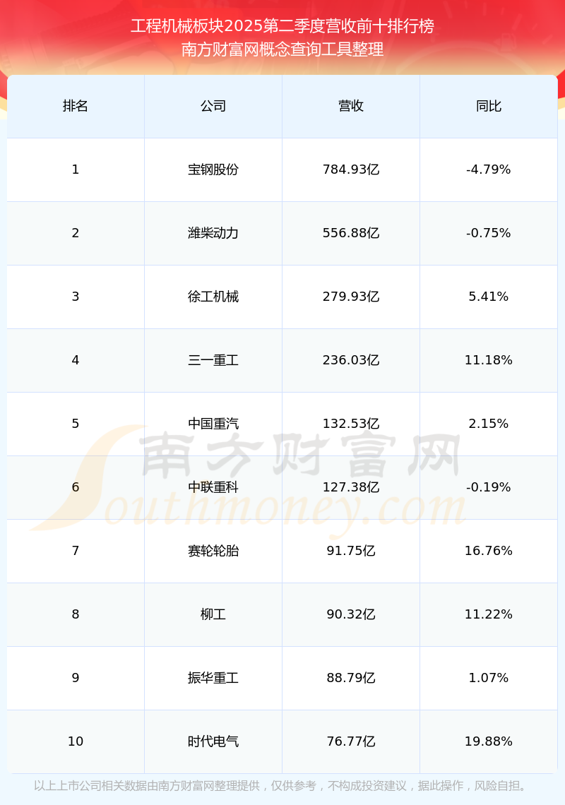 按照南方財(cái)富網(wǎng)概念查詢工具統(tǒng)計(jì),該股所屬板塊為工程機(jī)械板塊,該板塊共有92只股票,鐵建重工2025第二季度營收在該板塊中排名為第21名,該板塊2025第二季度營收排名前十的股票如下表: