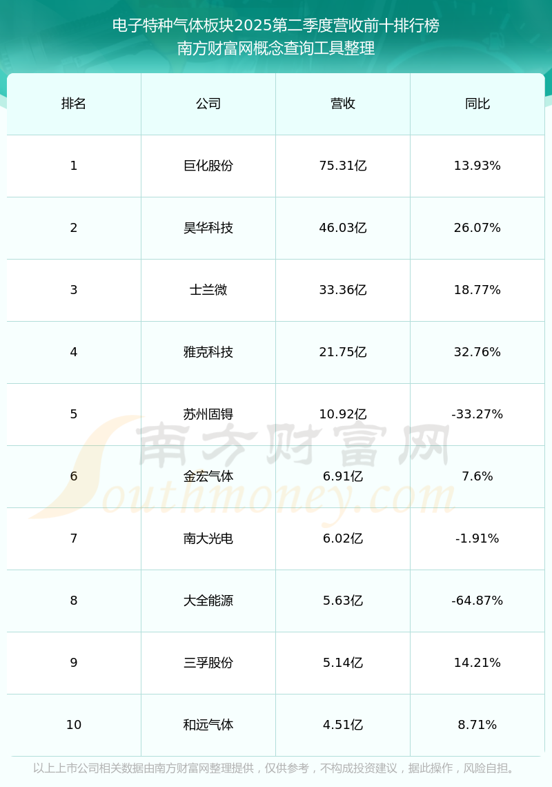 按照南方財(cái)富網(wǎng)概念查詢工具統(tǒng)計(jì),該股所屬板塊為電子特種氣體板塊,該板塊共有15只股票,中船特氣2025第二季度營(yíng)收在該板塊中排名為第15名,該板塊2025第二季度營(yíng)收排名前十的股票如下表: