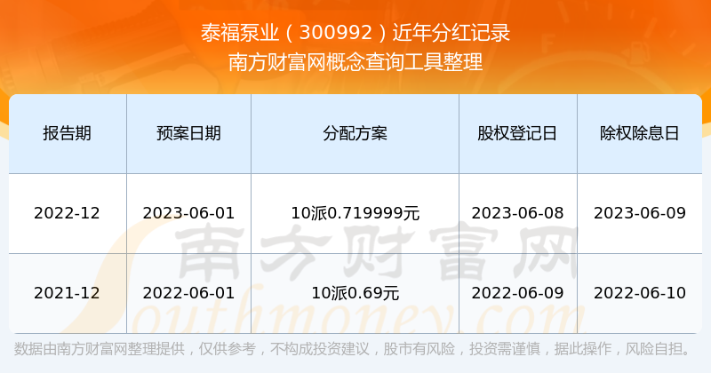 泰福泵業(yè)最新一次公布的分紅方案為10派0.719999元。本次權(quán)益分派股權(quán)登記日為2023年6月8日,除權(quán)除息日為2023年6月9日,派息日為2023年6月9日。