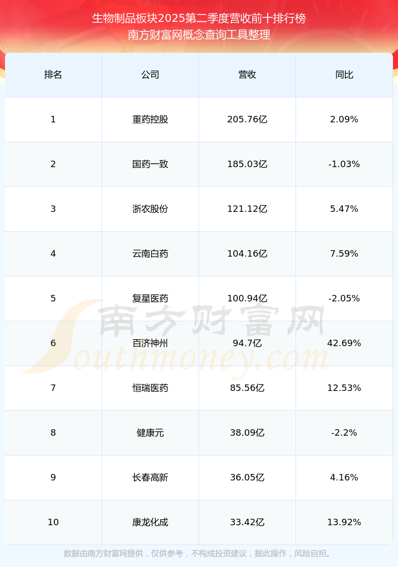 按照南方財(cái)富網(wǎng)概念查詢工具統(tǒng)計(jì),該股所屬板塊為生物制品板塊,該板塊共有148只股票,康辰藥業(yè)2025第二季度營收在該板塊中排名為第77名,該板塊2025第二季度營收排名前十的股票如下表: