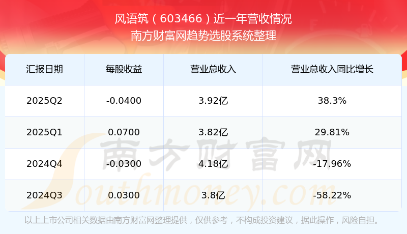 風(fēng)語筑2025年第二季度顯示,公司主營收入3.92億元,同比38.3%;歸母凈利潤-2332.24萬元,同比80.45%;扣非凈利潤-3256.09萬元,同比65%;