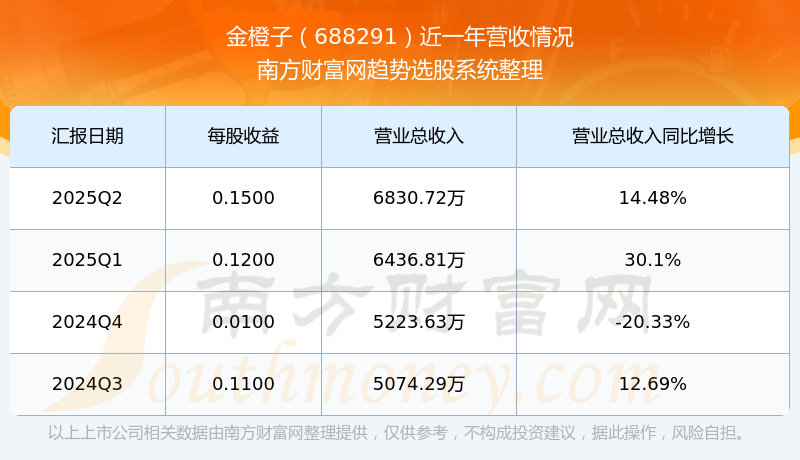 于2025年第二季度,金橙子披露了其業(yè)績(jī)表現(xiàn),其中主營(yíng)業(yè)務(wù)收入6830.72萬(wàn)元,相較于去年同期14.48%。此外,公司歸屬于母公司的凈利潤(rùn)為1573.33萬(wàn)元,同比增長(zhǎng)了58.7%。在扣除所有非經(jīng)常性損益后,凈利潤(rùn)1431.81萬(wàn)元,同比增長(zhǎng)93.91%。