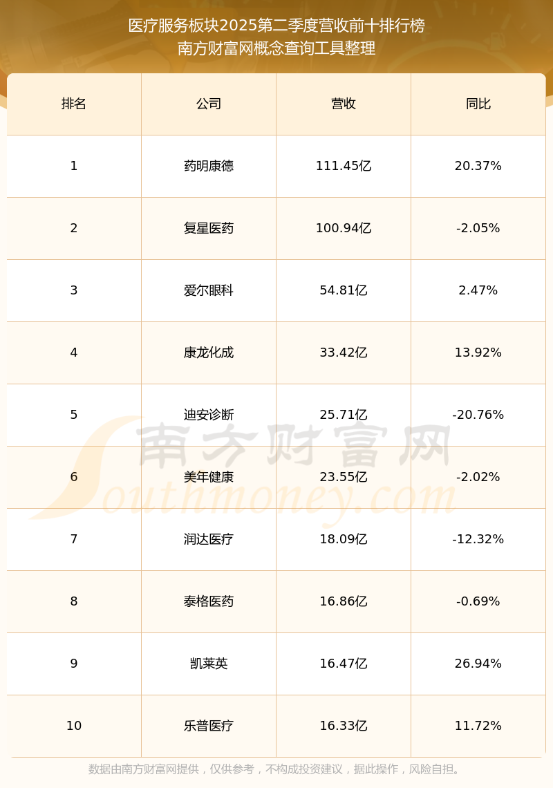 按照南方財(cái)富網(wǎng)概念查詢工具統(tǒng)計(jì),該股所屬板塊為醫(yī)療服務(wù)板塊,該板塊共有76只股票,新華醫(yī)療2025第二季度營收在該板塊中排名為第76名,該板塊2025第二季度營收排名前十的股票如下表: