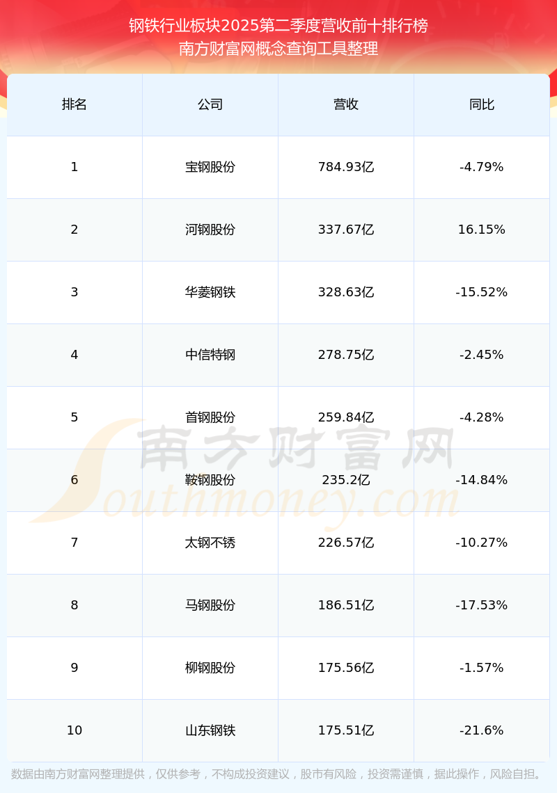 按照南方財(cái)富網(wǎng)概念查詢工具統(tǒng)計(jì),該股所屬板塊為鋼鐵行業(yè)板塊,該板塊共有41只股票,廣東明珠2025第二季度營(yíng)收在該板塊中排名為第41名,該板塊2025第二季度營(yíng)收排名前十的股票如下表: