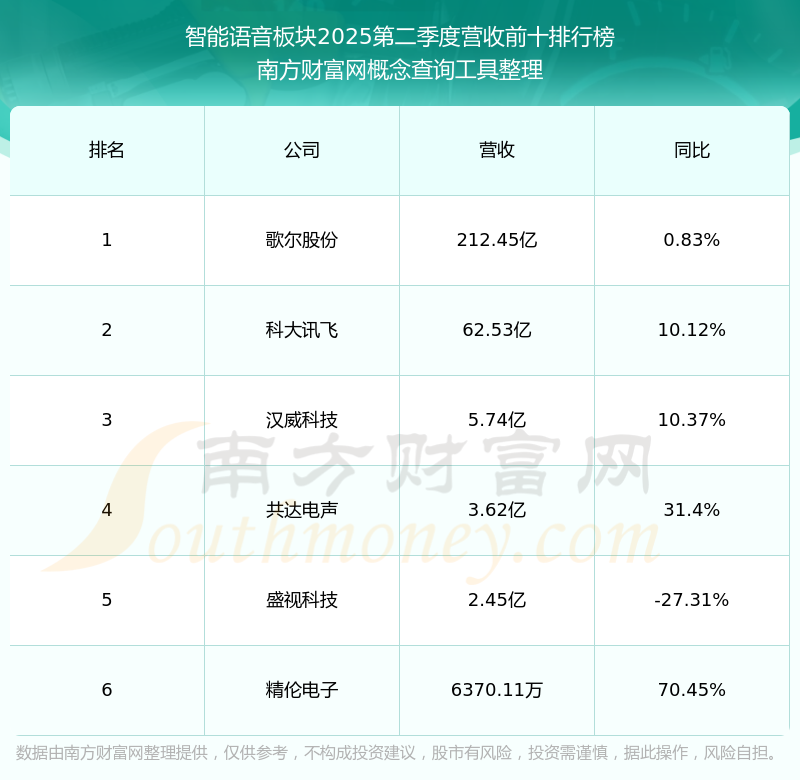 按照南方財富網(wǎng)概念查詢工具統(tǒng)計,該股所屬板塊為智能語音板塊,該板塊共有6只股票,海天瑞聲2025第二季度營收在該板塊中排名為第6名,該板塊2025第二季度營收排名前十的股票如下表: