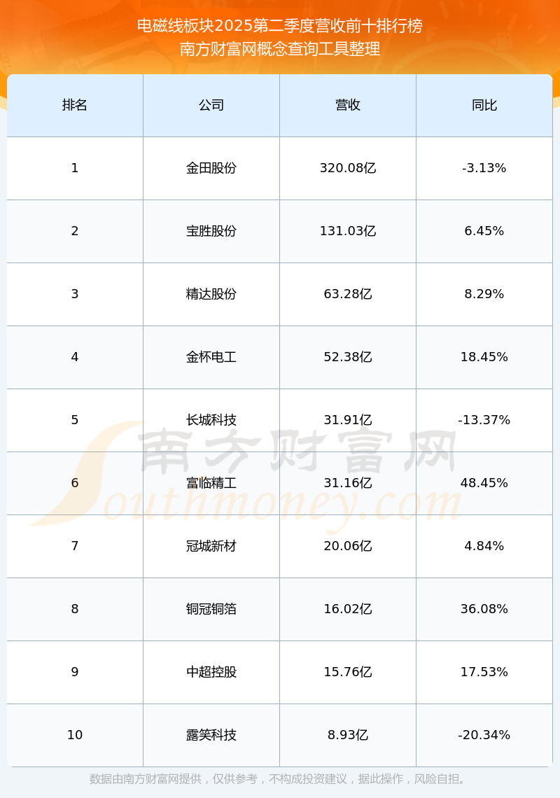 按照南方財富網(wǎng)概念查詢工具統(tǒng)計,該股所屬板塊為電磁線板塊,該板塊共有20只股票,冠城新材2025第二季度營收在該板塊中排名為第7名,該板塊2025第二季度營收排名前十的股票如下表: