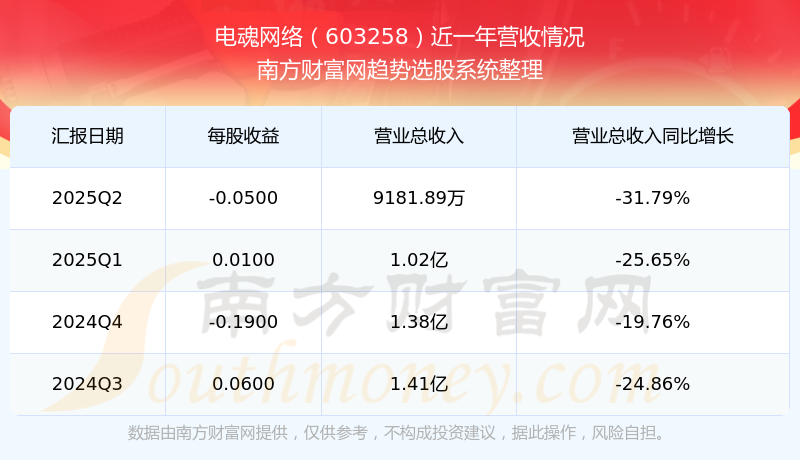 電魂網(wǎng)絡(luò)(603258)披露2025年第二季度報告,報告期實現(xiàn)營收9181.89萬元,同比-31.79%;歸母凈利潤-1094.82萬元,同比-184.65%;扣非凈利潤-1526.49萬元,同比-248.84%;基本每股收益-0.05元。