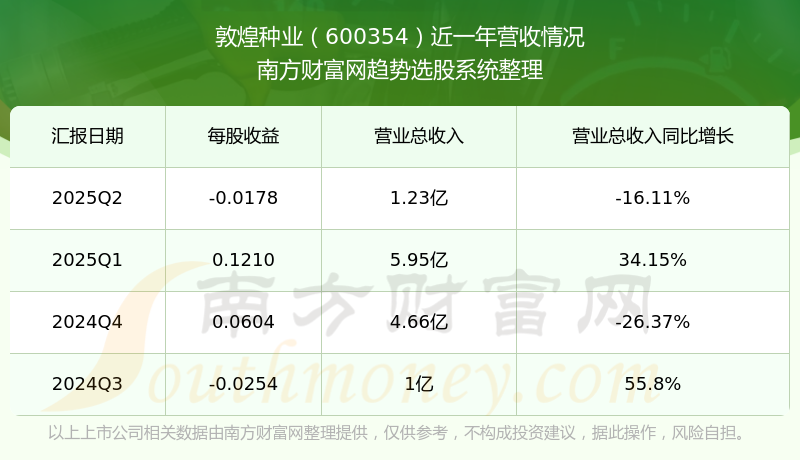 于2025年第二季度,敦煌種業(yè)披露了其業(yè)績表現(xiàn),其中主營業(yè)務(wù)收入1.23億元,相較于去年同期-16.11%。此外,公司歸屬于母公司的凈利潤為-942.59萬元,同比增長了-16.79%。在扣除所有非經(jīng)常性損益后,凈利潤-1207.05萬元,同比增長12.93%。