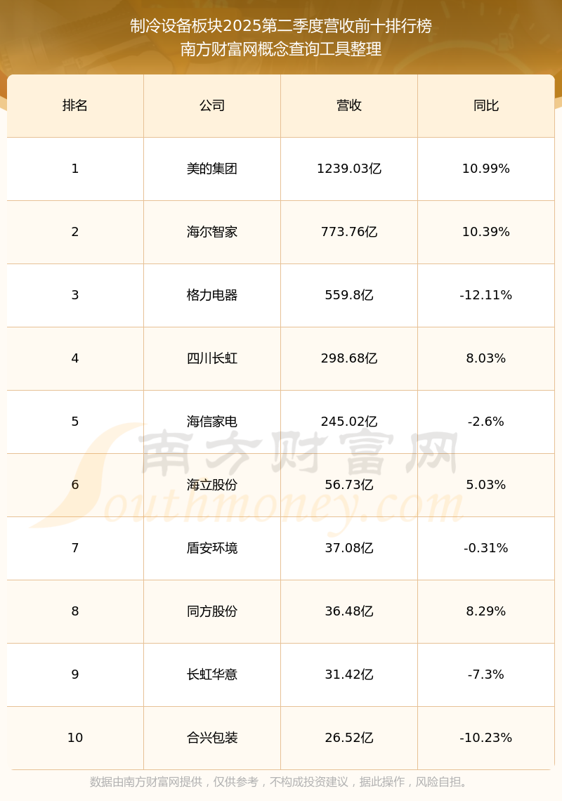 按照南方財(cái)富網(wǎng)概念查詢工具統(tǒng)計(jì),該股所屬板塊為制冷設(shè)備板塊,該板塊共有39只股票,東貝集團(tuán)2025第二季度營(yíng)收在該板塊中排名為第14名,該板塊2025第二季度營(yíng)收排名前十的股票如下表: