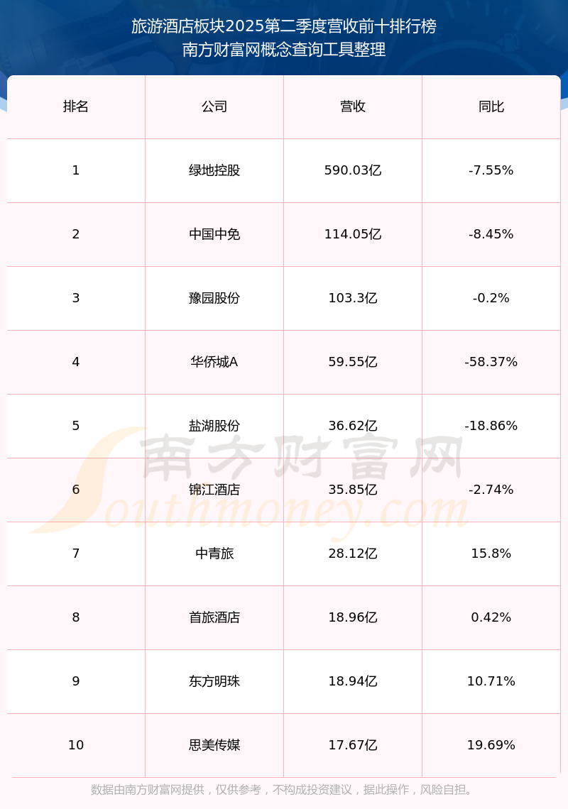 按照南方財富網(wǎng)概念查詢工具統(tǒng)計,該股所屬板塊為旅游酒店板塊,該板塊共有69只股票,中國中免2025第二季度營收在該板塊中排名為第2名,該板塊2025第二季度營收排名前十的股票如下表: