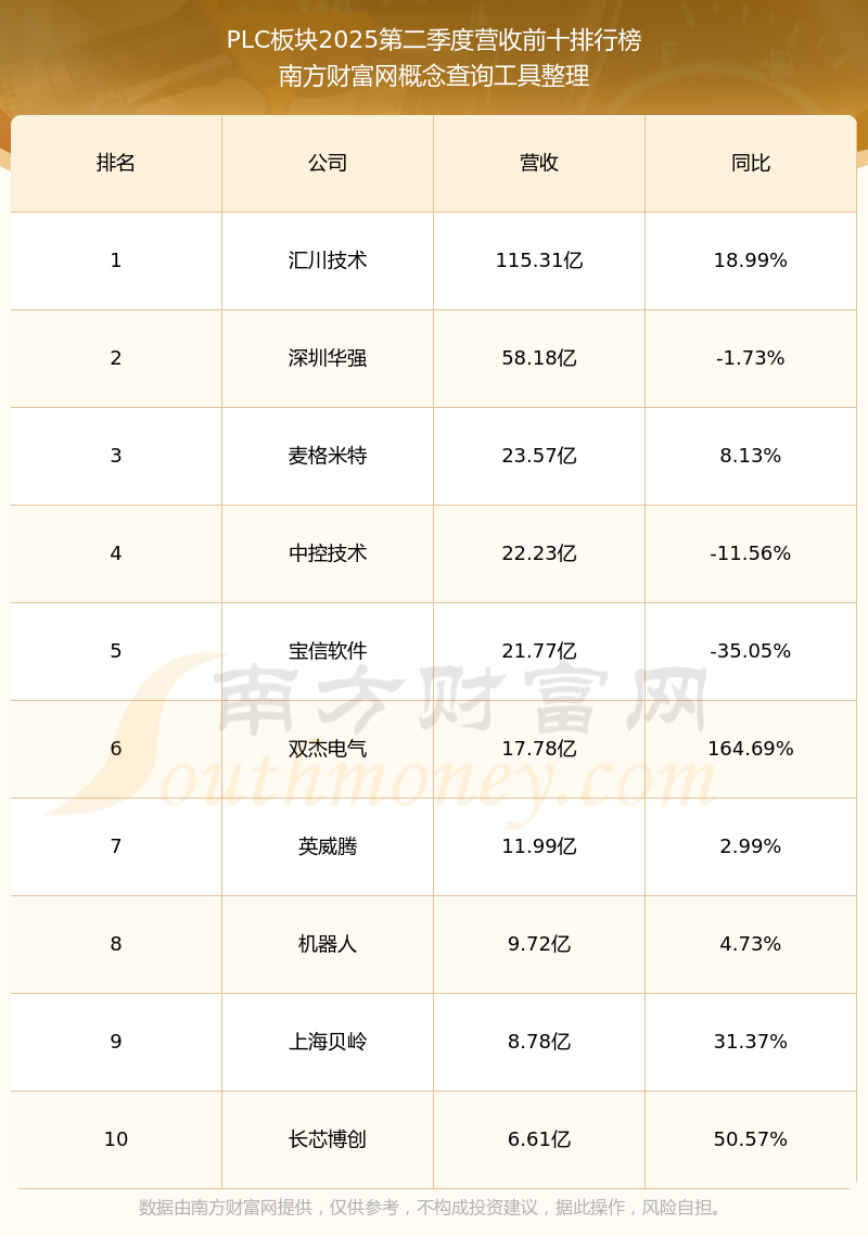 按照南方財富網(wǎng)概念查詢工具統(tǒng)計,該股所屬板塊為PLC板塊,該板塊共有25只股票,禾川科技2025第二季度營收在該板塊中排名為第21名,該板塊2025第二季度營收排名前十的股票如下表: