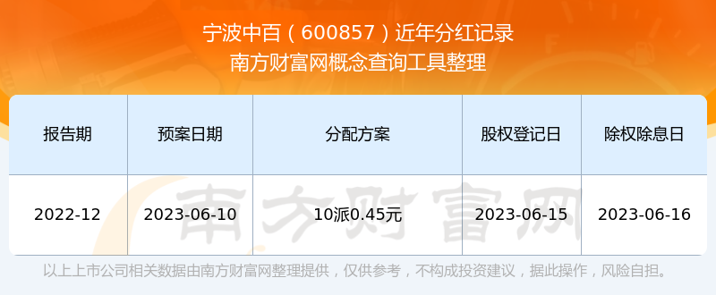 寧波中百最新一次公布的分紅方案為10派0.45元。本次權(quán)益分派股權(quán)登記日為2023年6月15日,除權(quán)除息日為2023年6月16日,派息日為2023年6月16日。