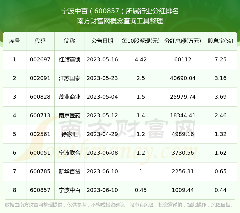 按照南方財富網(wǎng)趨勢選股系統(tǒng)統(tǒng)計,寧波中百所屬行業(yè)為商業(yè)百貨行業(yè),商業(yè)百貨行業(yè)分紅排名情況如下表:
