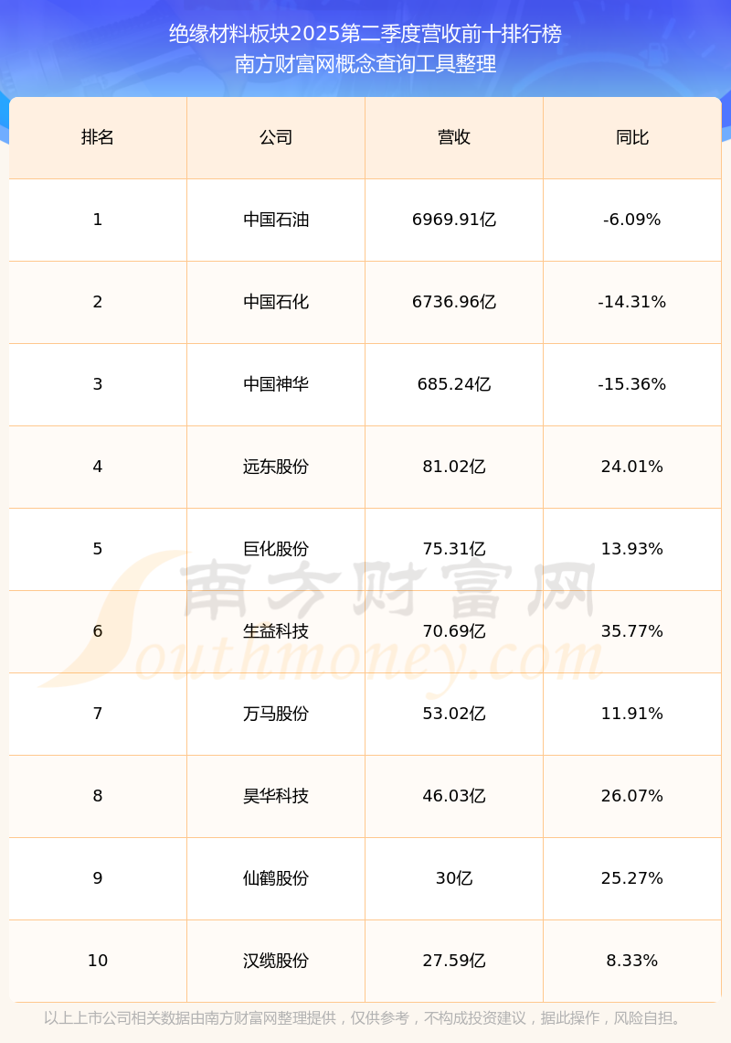 按照南方財(cái)富網(wǎng)概念查詢工具統(tǒng)計(jì),該股所屬板塊為絕緣材料板塊,該板塊共有31只股票,東材科技2025第二季度營(yíng)收在該板塊中排名為第11名,該板塊2025第二季度營(yíng)收排名前十的股票如下表: