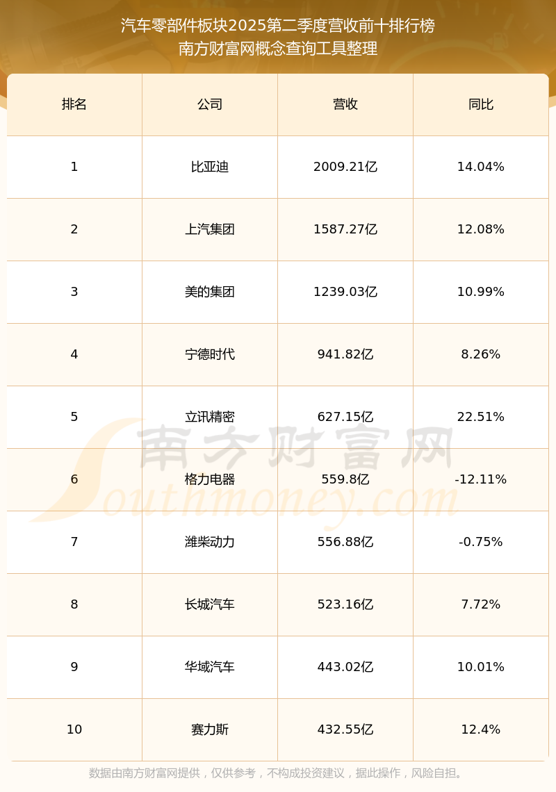 按照南方財富網(wǎng)概念查詢工具統(tǒng)計,該股所屬板塊為汽車零部件板塊,該板塊共有567只股票,北特科技2025第二季度營收在該板塊中排名為第300名,該板塊2025第二季度營收排名前十的股票如下表: