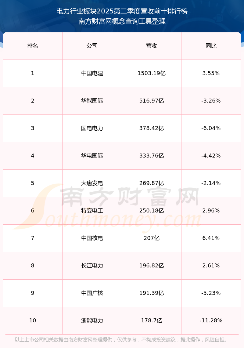 按照南方財(cái)富網(wǎng)概念查詢工具統(tǒng)計(jì),該股所屬板塊為電力行業(yè)板塊,該板塊共有93只股票,京能電力2025第二季度營收在該板塊中排名為第20名,該板塊2025第二季度營收排名前十的股票如下表: