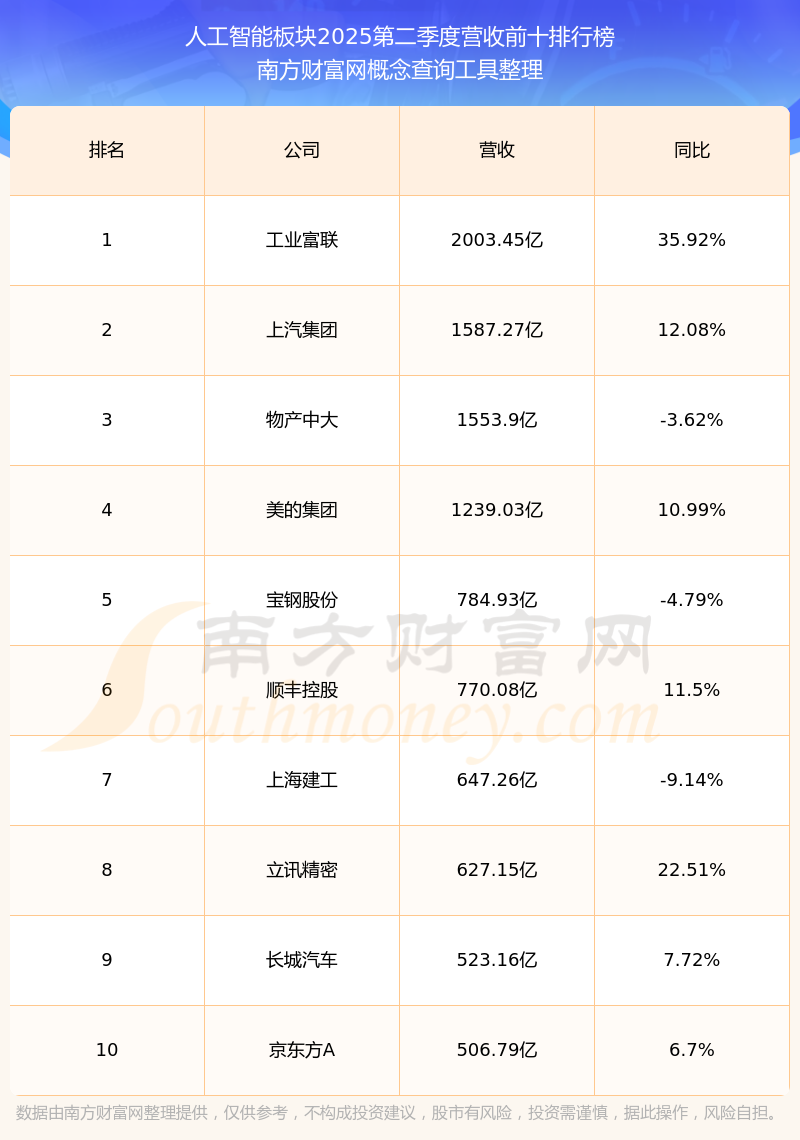 按照南方財富網(wǎng)概念查詢工具統(tǒng)計,該股所屬板塊為人工智能板塊,該板塊共有966只股票,云天勵飛2025第二季度營收在該板塊中排名為第505名,該板塊2025第二季度營收排名前十的股票如下表: