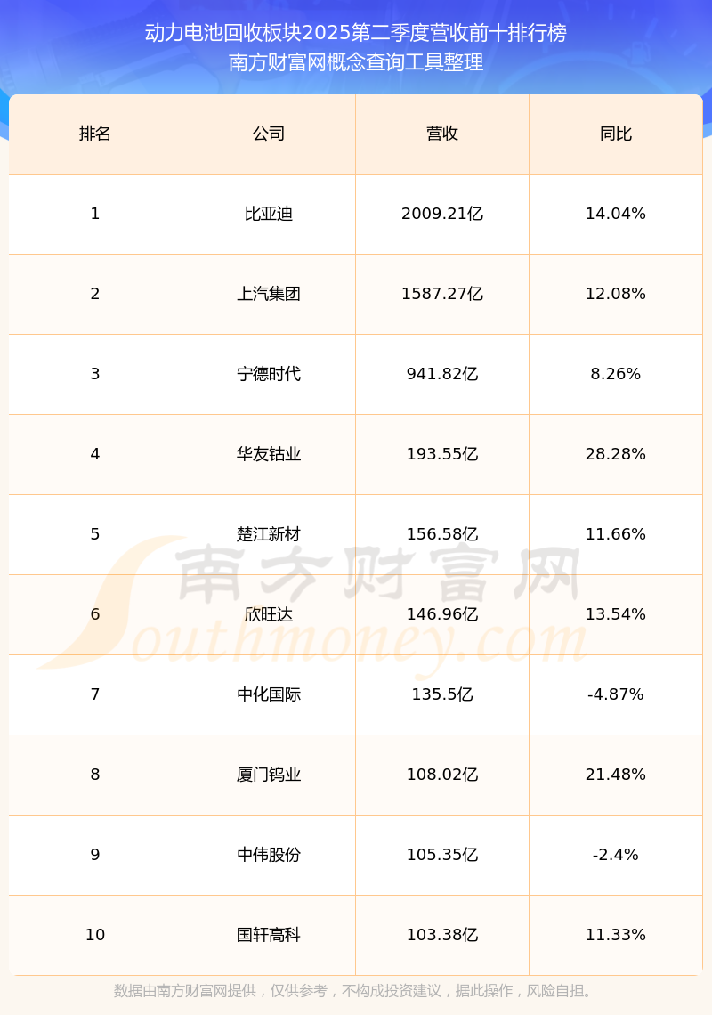按照南方財富網(wǎng)概念查詢工具統(tǒng)計,該股所屬板塊為動力電池回收板塊,該板塊共有70只股票,駱駝股份2025第二季度營收在該板塊中排名為第21名,該板塊2025第二季度營收排名前十的股票如下表: