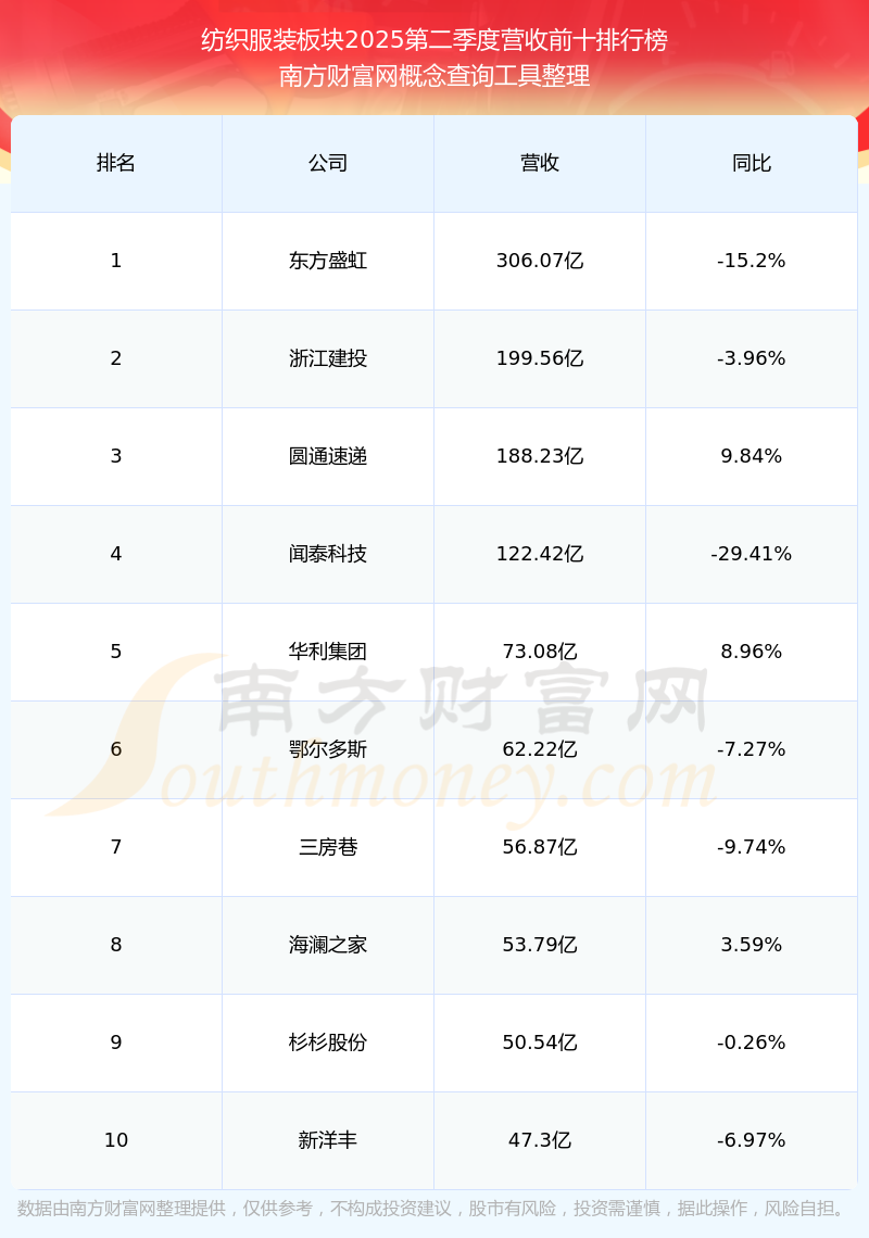 按照南方財富網(wǎng)概念查詢工具統(tǒng)計,該股所屬板塊為紡織服裝板塊,該板塊共有155只股票,地素時尚2025第二季度營收在該板塊中排名為第69名,該板塊2025第二季度營收排名前十的股票如下表: